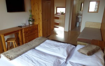The room has its own bathroom (toilet, washbasin, shower), LED TV and a balcony with seating and views of the High Tatras.